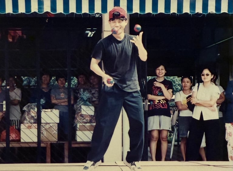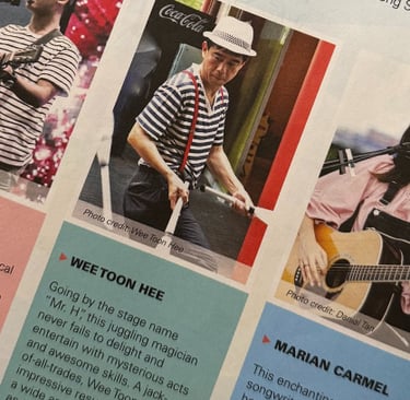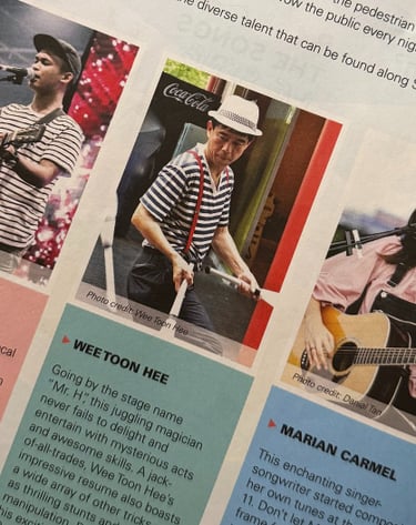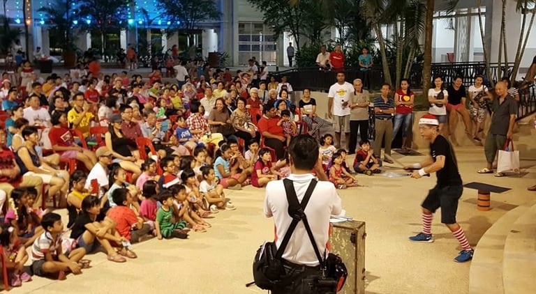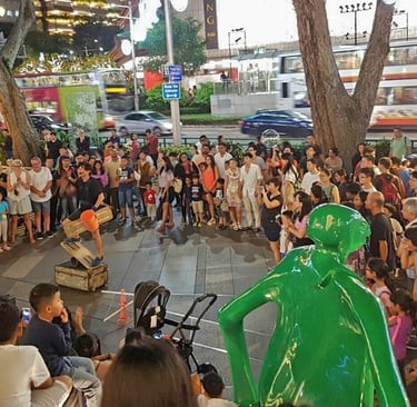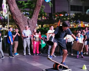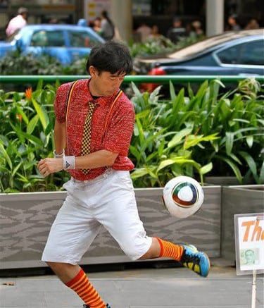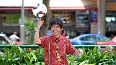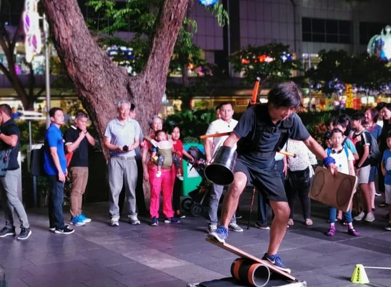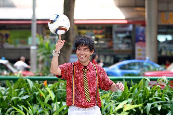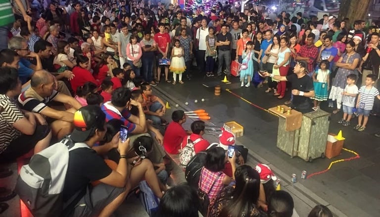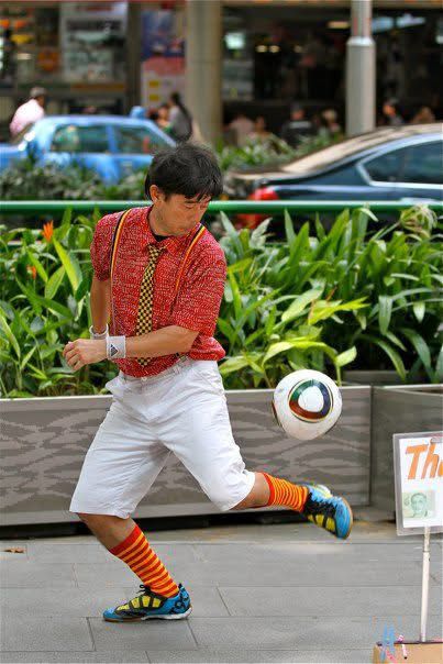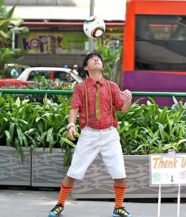 Then-Prime Minister Lee Hsien Loong watching on intently as H the Juggler performs the balancing act, AKA Rola Bola, along Orchard Road.